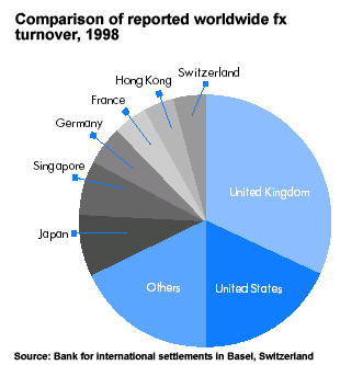Among the various financial centers around the world, the largest amount of foreign exchange trading takes place in the United Kingdom, even though that nation's currency, the British pound is less widely traded in the currency market than several others. As shown in the graph underneath, the United Kingdom accounts for about 32 percent of the global total; the United States ranks a distant second with about 18 percent, and Japan is third with 8 percent.
